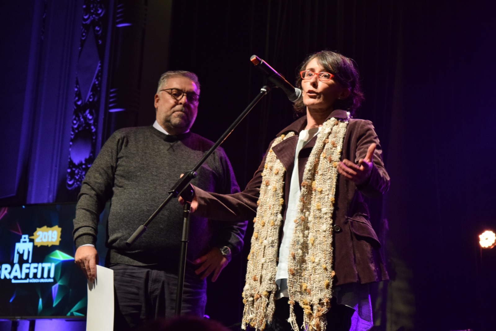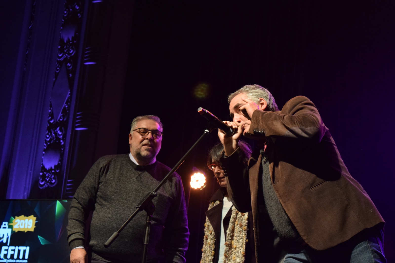 Nuestro tercer representante en el escenario de los Graffitis fue el consejero Martín Erniaga, firme impulsor de la actual exitosa gestión de la sala —en manos del propio sindicato— y también alma mater de Radio Camacuá. Con solo una breve frase destacó el propósito de AEBU destinado a poner el énfasis en estas iniciativas: «La cultura es inserción social».
