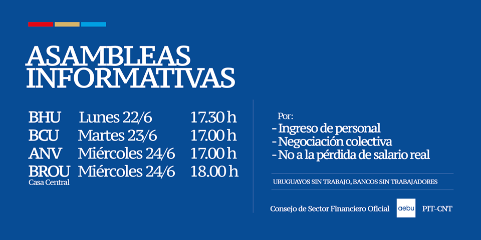 Con estos antecedentes se resolvió realizar asambleas informativas y ya hoy, a las 17.30 se efectuará la primera en el Banco Hipotecario. Esta serie continuará mañana, martes 23 a las 16.30 en el Banco Central, y el miércoles 24 habrá dos instancias: a las 17 se reunirán los compañeros de la ANV y a las 18 lo harán los de Casa Central del BROU.