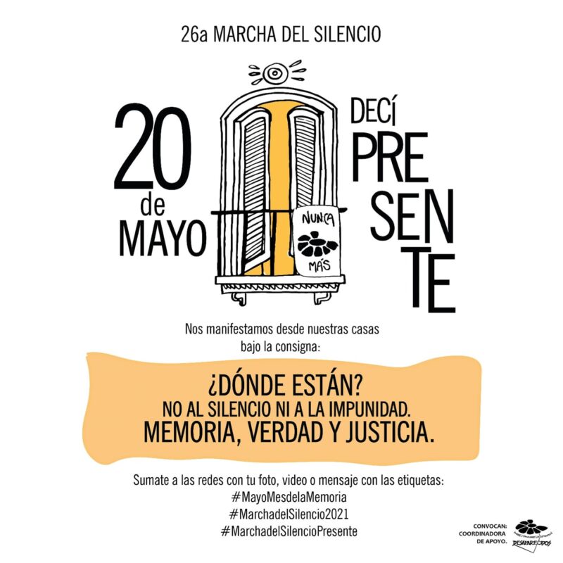 Rodeadas por el calor del pueblo, Madres y Familiares de Uruguayos Detenidos Desaparecidos nos convocan a compartir una Marcha del Silencio, en la que 18 de Julio se presentará desierta y solo podrán verse en ella las imágenes de los desaparecidos. En esta edición la consigna es «¿Dónde están? No al silencio ni a la impunidad. Memoria, verdad y justicia».